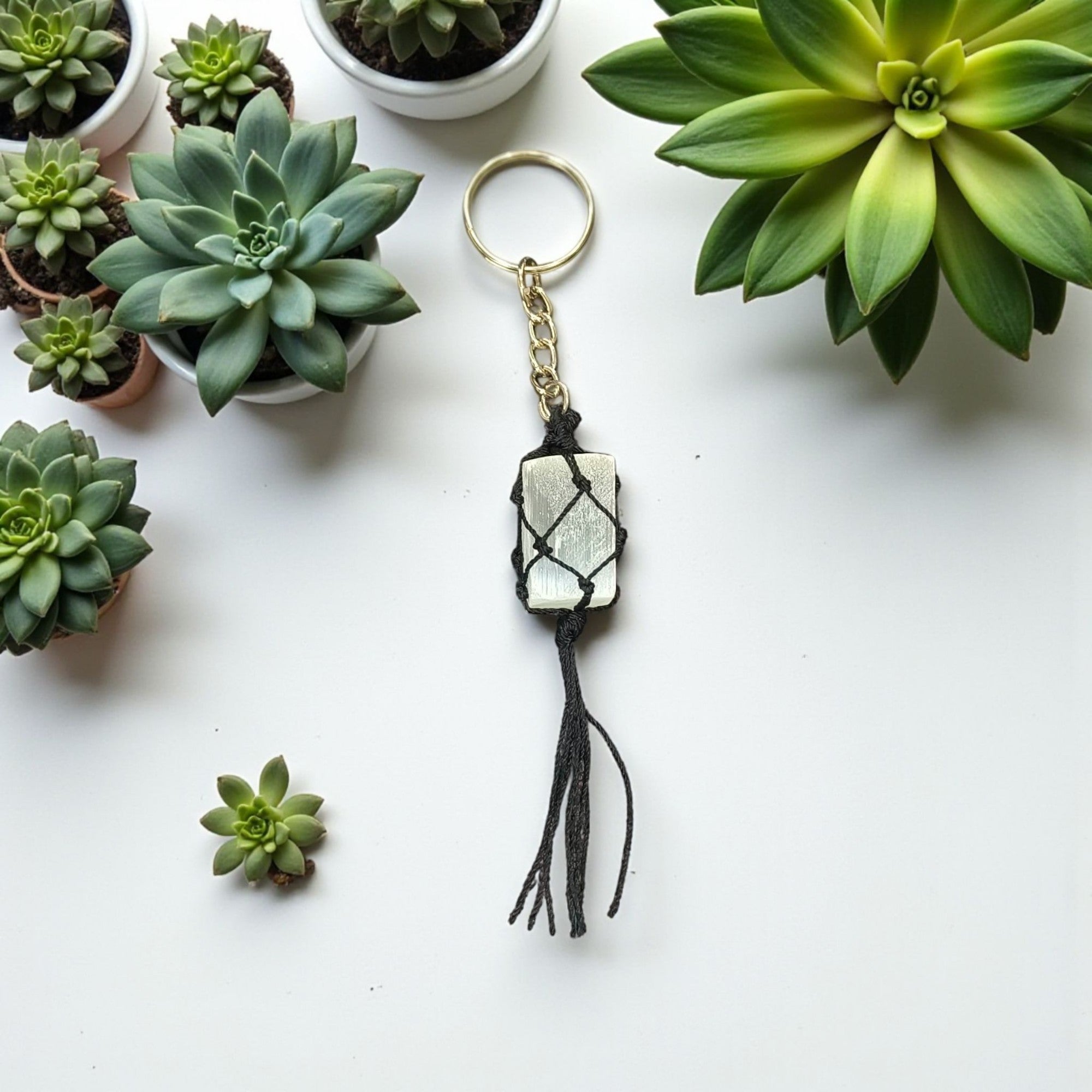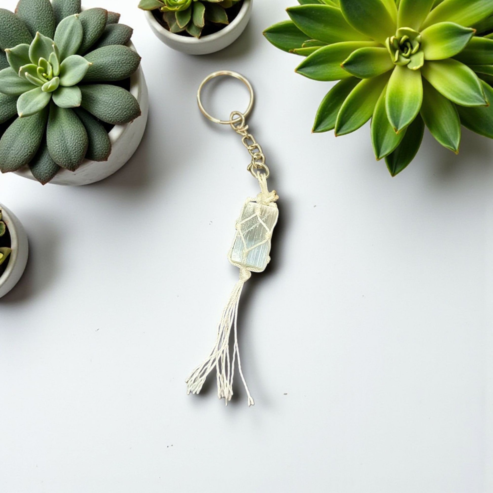 Carry calmness and cleansing energy wherever you go with our Handmade Selenite Raw Tumble Key Ring. Crafted with a natural selenite raw piece and hand-wrapped using durable thread, this key ring is available in white thread and black thread—both offering a minimal, elegant, and spiritual look.